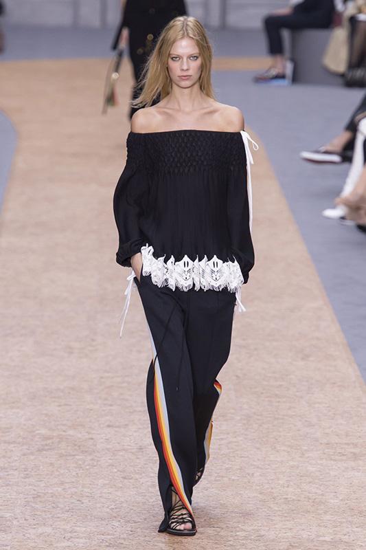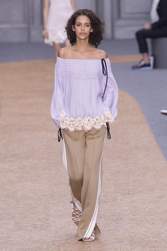 不仅如此,设计师放弃传统又刻板的运动套装,让柔美清新的露肩上衣、V 领背心等做配饰,加上轻盈的羽毛、蝴蝶结和蕾丝等装饰,令运动裤不再显得沉闷。经过Chloé 的诠释,相信会重新卷起运动裤的新潮流!