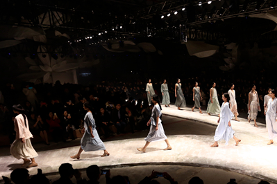 毛继鸿:这场夏季发布会以宋代山水花鸟画为灵感,你会明显看到正常秀有四块不同系列,节奏、氛围都很不一样,这是我们本季分别通过“清”、“云”、“墨”、“气”四个篇章来表现宋文化与例外美学的融合相通。