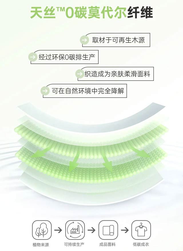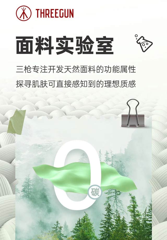 无论是出于对国家“双碳”政策的响应,时尚可持续发展潮流的追随,还是基于近两年来疫情不断反复冲击线上线下销售、原材料上涨、企业运营成本增加的挑战压力,企业的节能减排、低碳生产都迫在眉睫!三枪集团也紧跟国家绿色风向标,充分展现了近百年民族企业的担当。今年开始,三枪与奥地利兰精集团合作,推出了天丝 0 碳莫代尔纤维产品。天丝 0碳莫代尔取材于可再生榉木木源,经过环保 0 碳排生产工序,制造成为亲肤柔滑面料,并且可以在自然环境中完全降解。三枪 0 碳莫代尔环保产品的上市是集团未来逐步实现 0 碳计划的重要举措,产品一经上市,收到了三枪忠实消费者的喜爱。